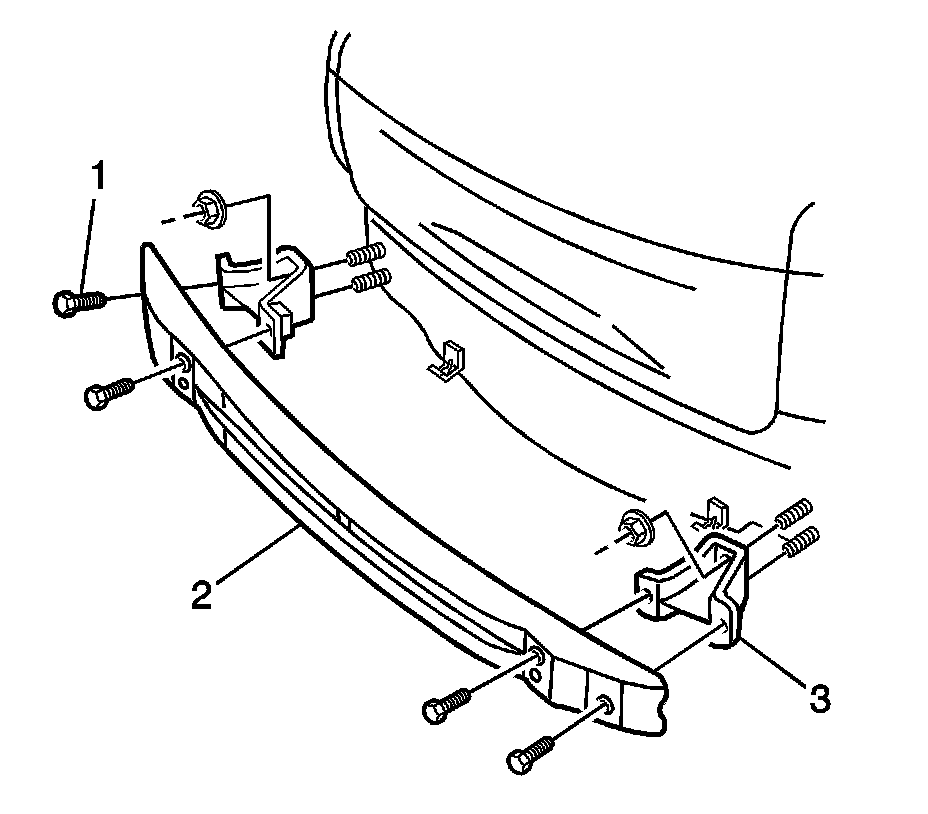 2. Install the 4 bolts (1) attaching the rear bumper impact bar (2) to the rear bumper impact bar brackets (3).