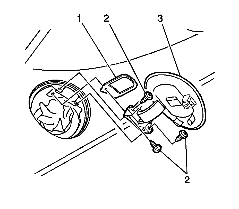 3. Remove the 3 screws (2) attaching the fuel filler door assembly (3).
