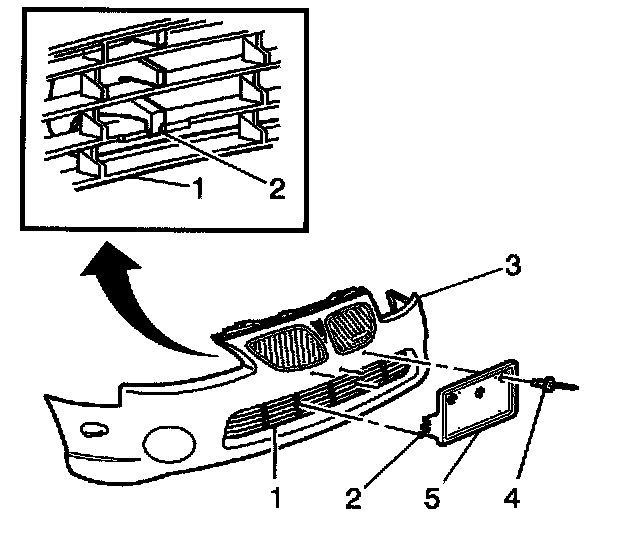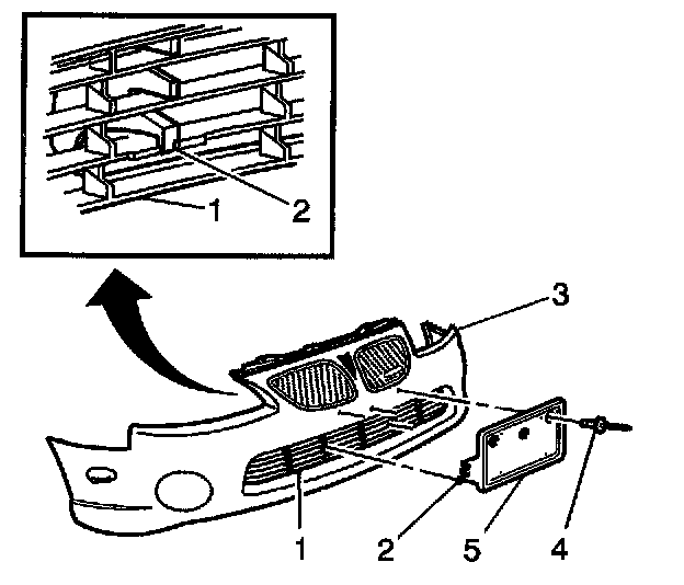 2. Position the bracket (5) to the front fascia (3), ensuring the clips (2) engage to the lower fascia grille (1).