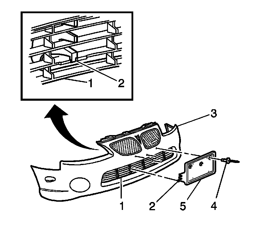 2. Position the bracket (5) to the front fascia (3), ensuring the clips (2) engage to the lower fascia grille (1).