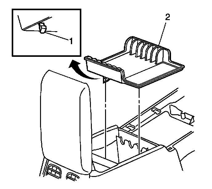 1. Install the floor console compartment (2) to the floor console making sure the 2 retaining tabs are engaged.