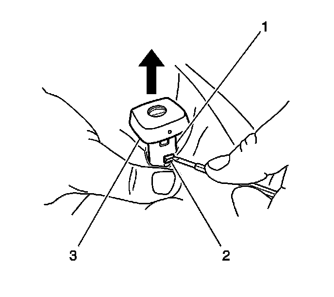 3. Press the head restraint guide retaining lug (2), then remove the guide (3) from the frame.