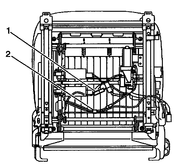 3. Attach the seat belt pretensioner wiring harness (2) to the seat cushion frame.
