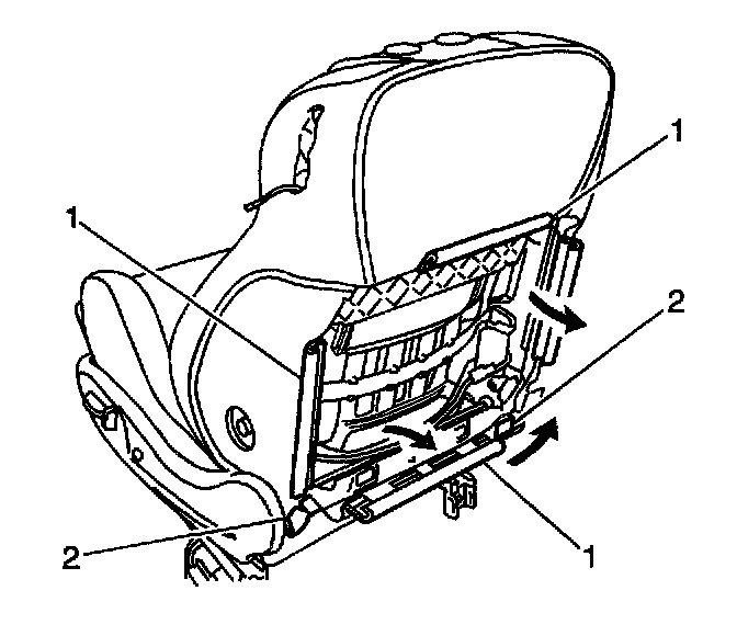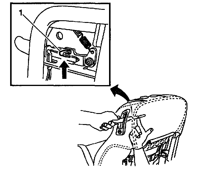 5. While holding upward pressure on the retaining clip, grasp the release lever (1) and pull away from the seat back to remove.