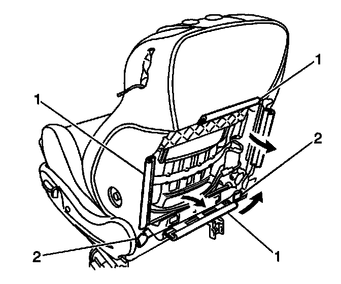 3. Disengage the seat back cover J-clips (1) and the Velcro tabs (2) at the lower corners.