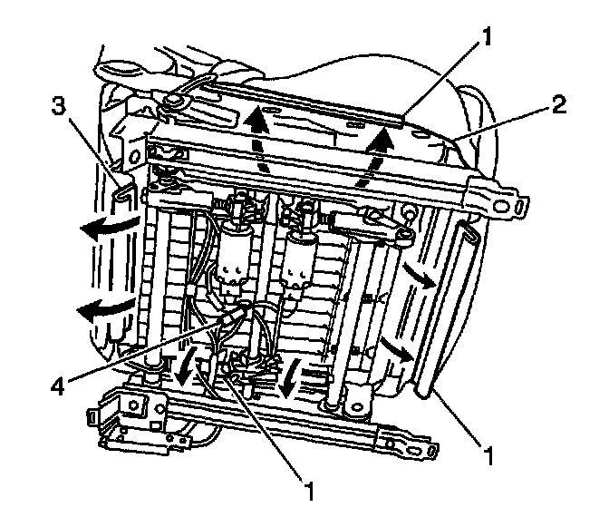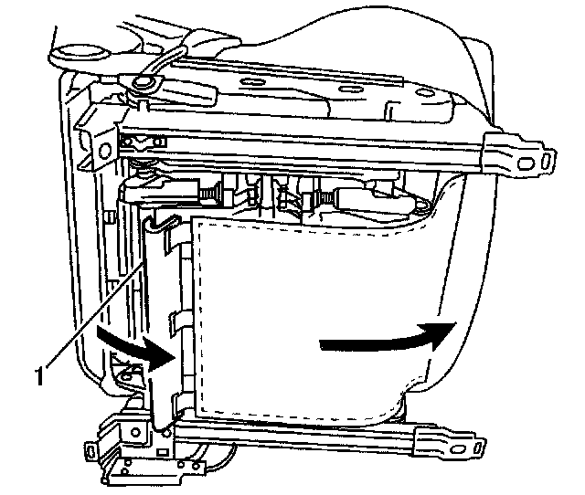 6. Pull the front and side J-clip (1) away from the seat frame (2).