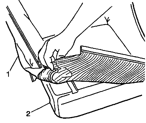 7. Roll the front corners (1) of the seat cushion cover over the seat cushion pad (2).