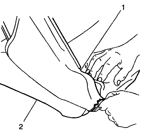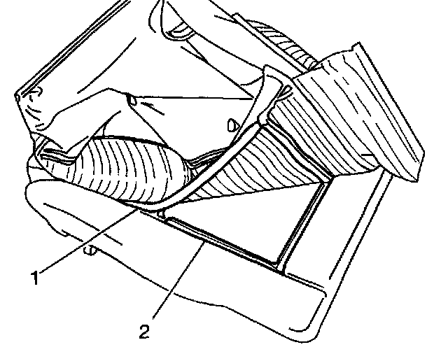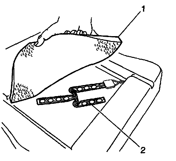 12. If required, peel back the upper cushion pad (1) to expose the passenger presence detector switch (2).