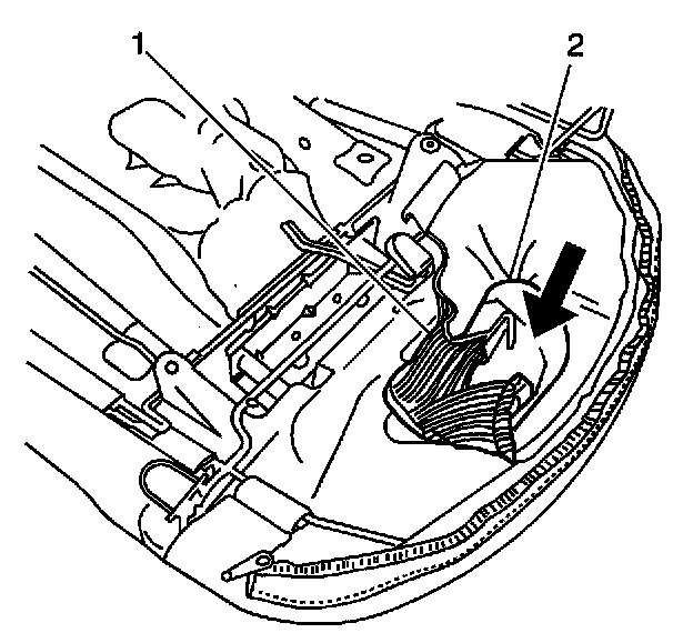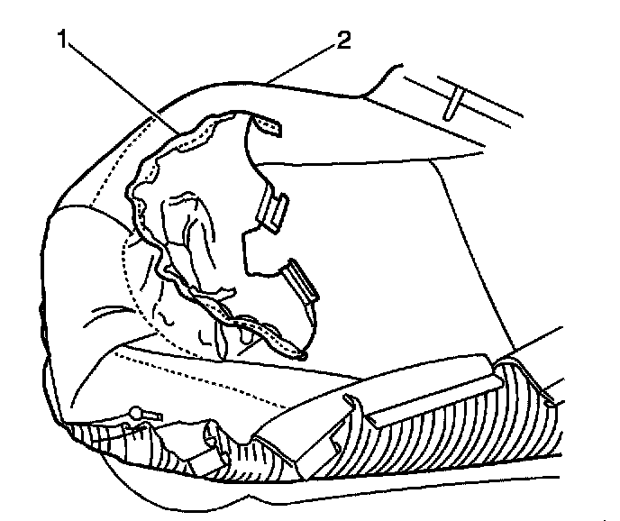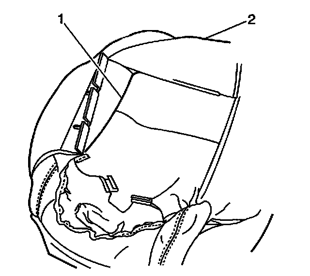 8. Push the rear seat back cover flap (1), through the opening in the rear seat back pad (2).