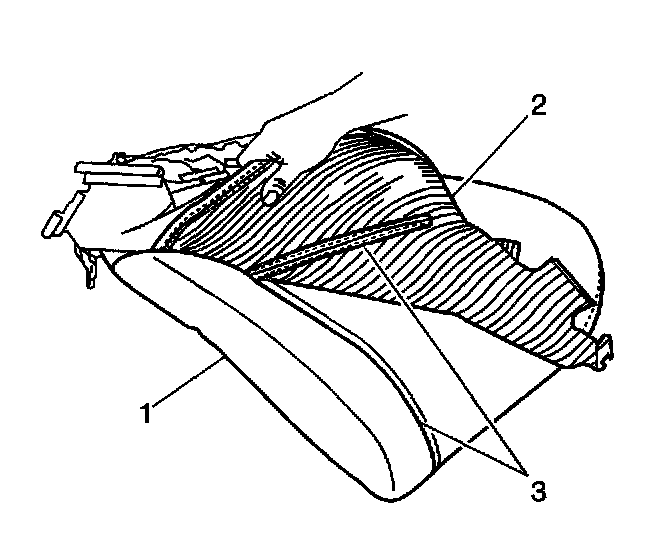 13. While holding the front seat back pad (1), pull the lower corners of the seat back cover (2), upwards and away from the seat pad to disengage the hook and loop strips (3).
