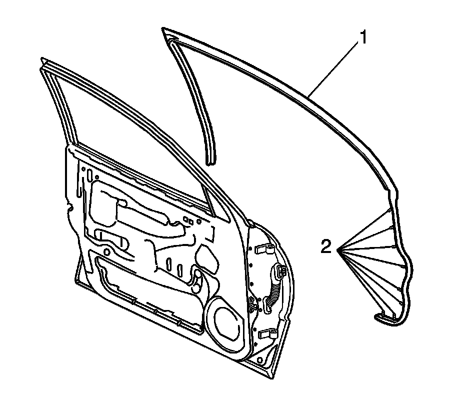 2. Remove the door upper weather-strip (1) from the belt line, allowing the retainer clips (2) to pull out of the weather-strip and remain in the door.