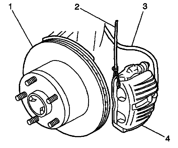 3. Remove the brake caliper and the pads as an assembly and support the assembly with heavy mechanic's wire (2), or equivalent. Verify that there is no tension on the brake hose (3). Refer to Brake Caliper Replacement - Front.