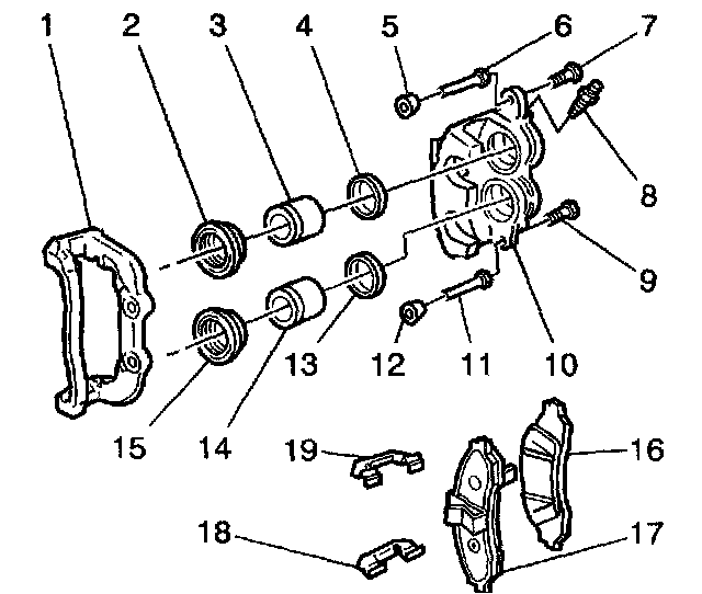 3. Inspect the guide pin bores for corrosion or wear. Replace the caliper assembly if damage is evident.