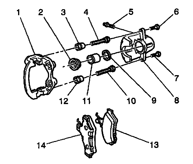 4. Identify the outer brake pad (14). The outer brake pad has a full shim on the backing plate.