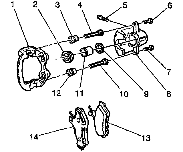 12. Gently pull the caliper slide pins (4,10) inward and outward without disengaging the slide pins from the boots (3,12).