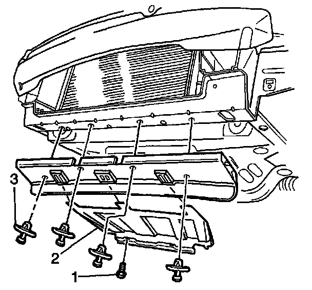 1. Position the lower air baffle to the crossmember, then install four lower front air baffle-to-crossmember fasteners (3).