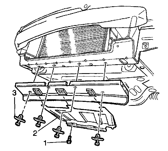 5. Remove four lower front air baffle-to-crossmember fasteners (3), then remove the front lower air baffle.