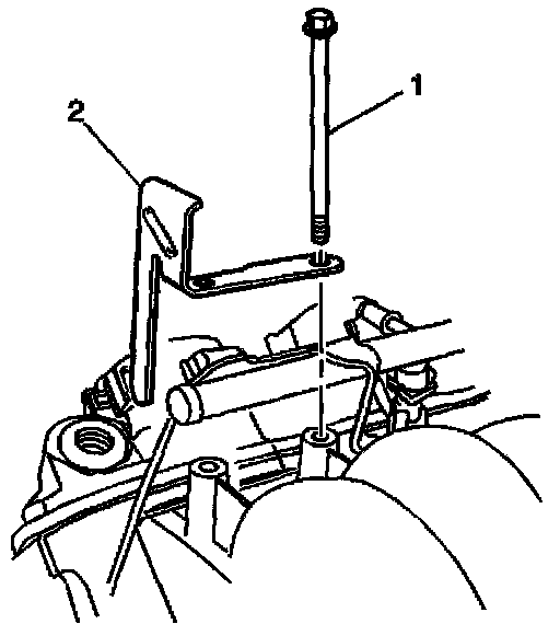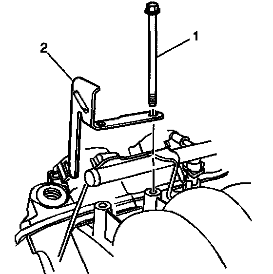 29. Remove the intake manifold bolts (1) and fuel rail stop bracket (2).