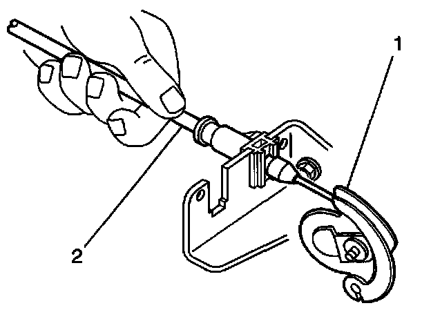 14. Lift the throttle cable (2) up at the throttle body mounting bracket, then remove the cable from the throttle body cam lever (1)