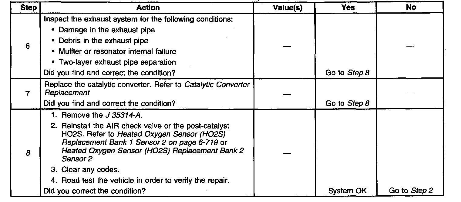 Removing the secondary air injection (AIR) check valve or the heated oxygen sensor (HO2S) may set a DTC. When finishing this diagnostic table, be sure to clear all codes.