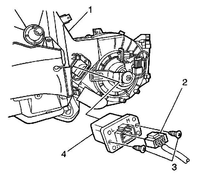 2. Disconnect the wiring harness electrical connector (2) from the blower motor resistor (4).