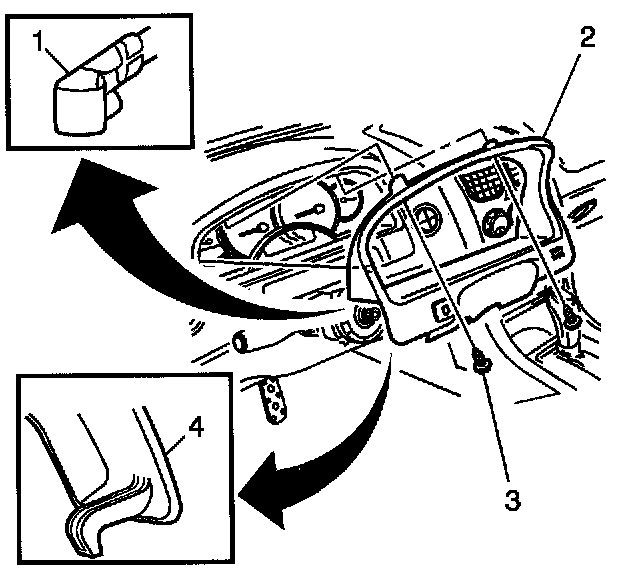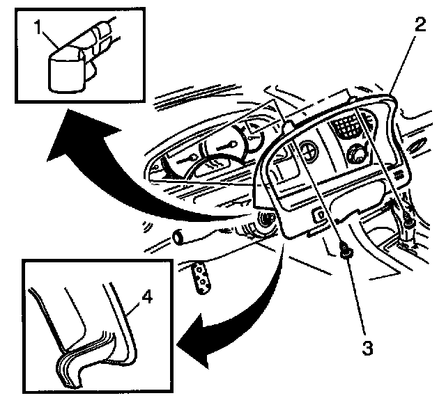 3. Install the cluster trim panel (2) to the instrument panel, making sure the retaining lugs (4) and the retaining clips (1) are engaged.