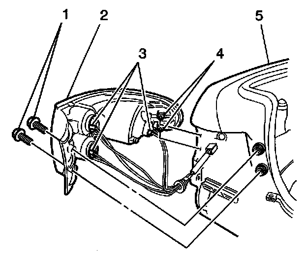 3. Position the tail lamp assembly (2) to the rear body panel (5) and align the locating pegs (4) with the retainers.