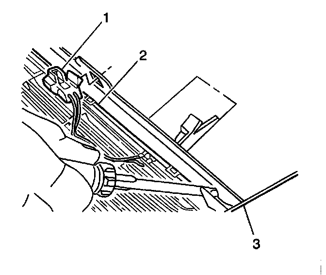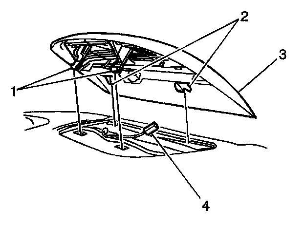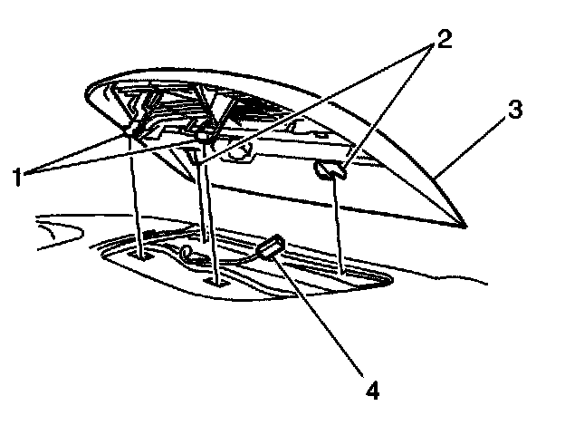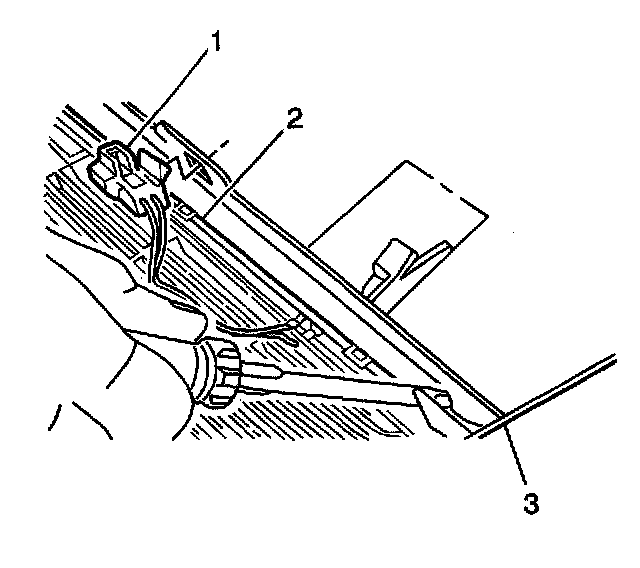 3. From inside the vehicle, grasp the edge of the high mount stop lamp assembly (3) and pull the assembly up and away from the rear windscreen until the locating tabs (2) are free of the slots.