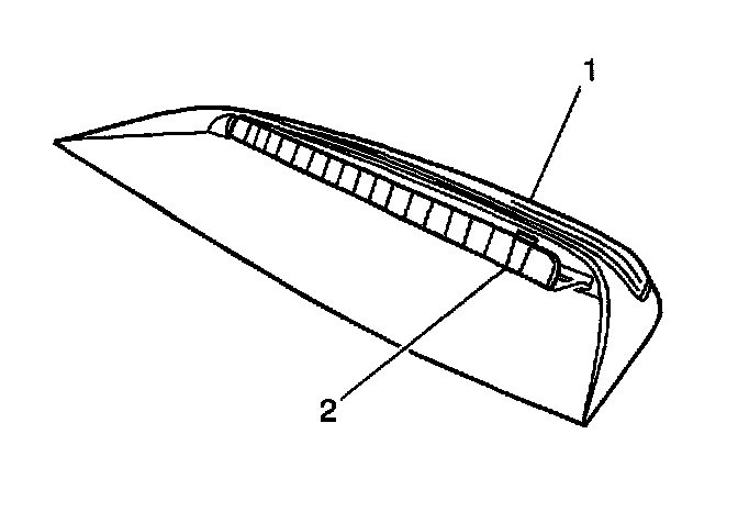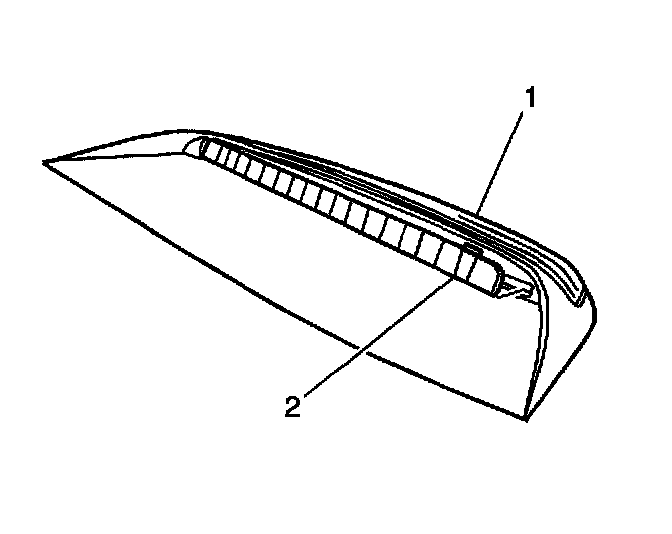5. Position the high mount stop lamp assembly (3) to the vehicle and position to the locating tabs (2) to the slots and push down until the retaining tabs (1) are engaged.