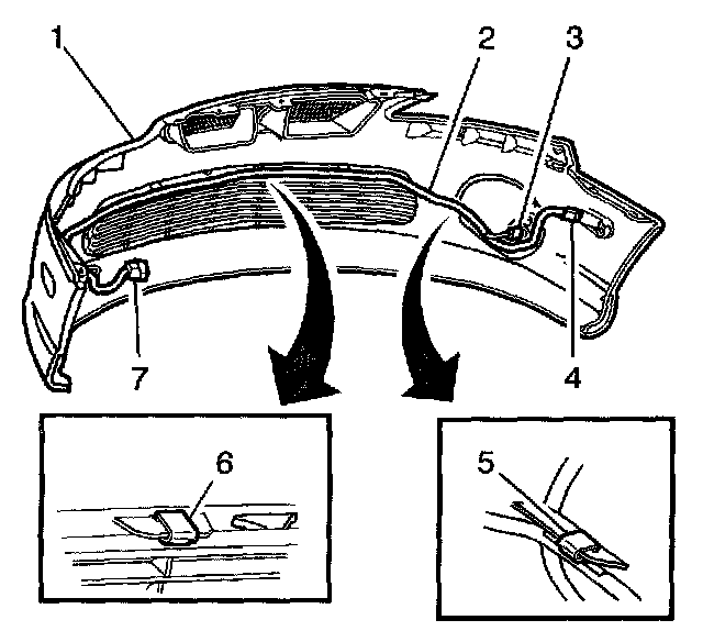 2. Fasten the harness retainers (6) along the top of the lower fascia grille.