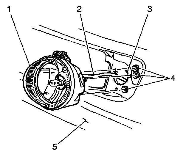 3. Remove the three nuts (4) securing the front fog lamp assembly (1) to the bumper bar fascia (5).