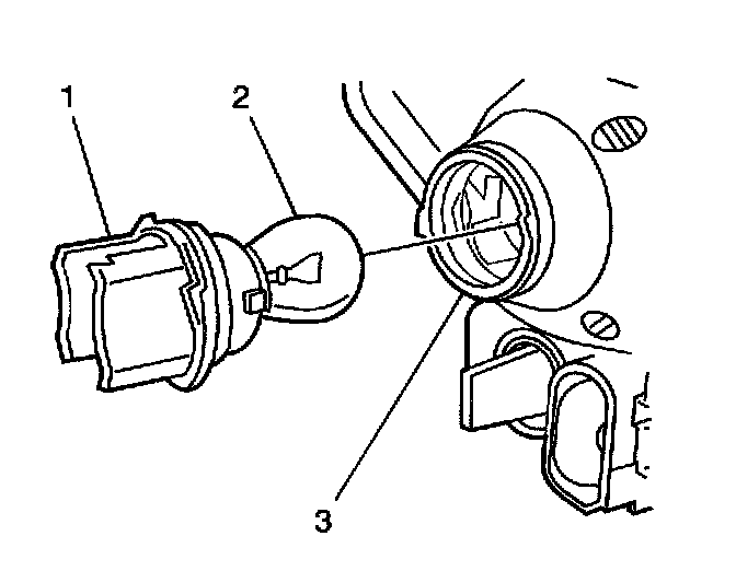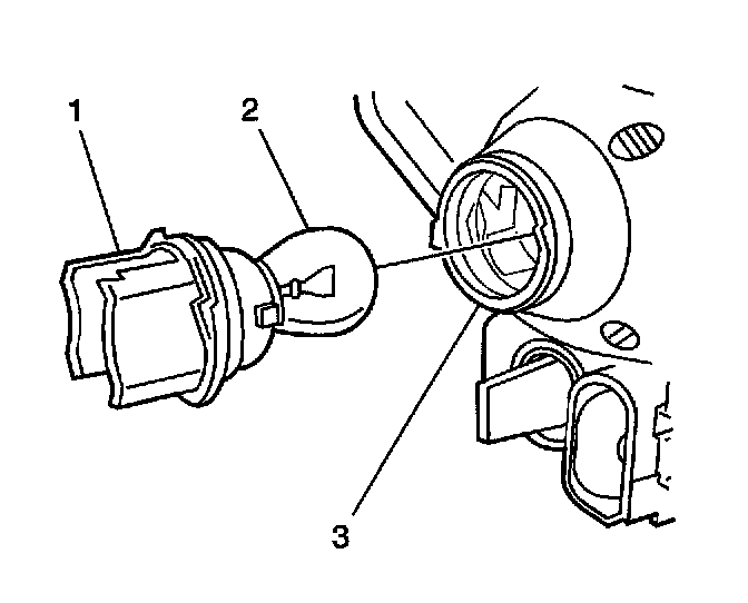 5. From within the engine compartment, remove the socket (1) from the headlamp assembly (3) by rotating it counterclockwise and then pulling it away from the headlamp assembly (3).