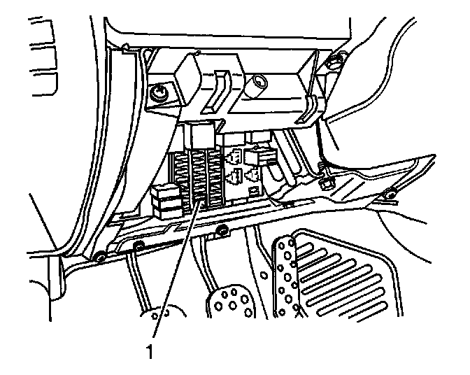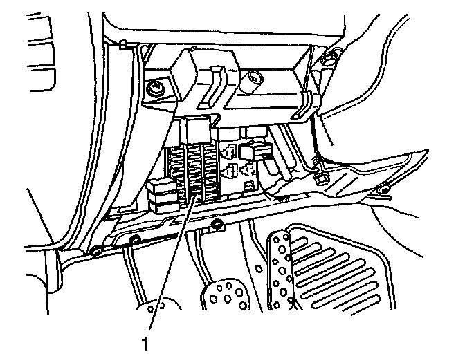 3. Locate and remove the SIR fuse from the instrument panel (I/P) fuse panel (1), which is located near the base of the steering column.