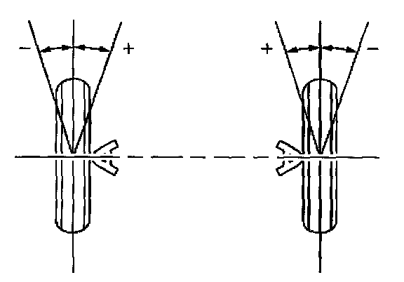 Camber is the tilting of the wheels from the vertical when viewed from the front of the vehicle. When the wheels tilt outward at the top, the camber is positive (+) When the wheel tilts inward at the top the camber is negative (-). The amount of tilt is measured in degrees from the vertical. Camber settings influence the directional control and the tire wear.