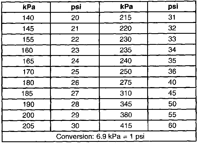 Inflation Pressure Conversion (Kilopascals to PSI)