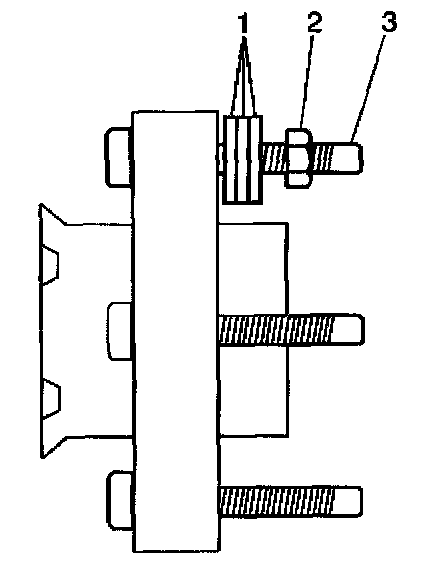 3. Install 3 washers and a wheel nut (2) onto the wheel stud.