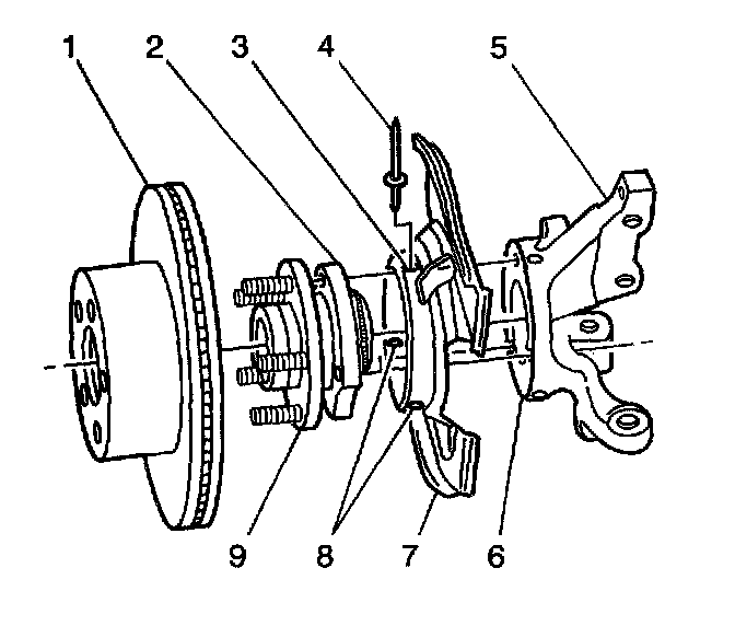 5. Rotate the hub in order to align the stud with the access hole in the shield and the recess in the knuckle.