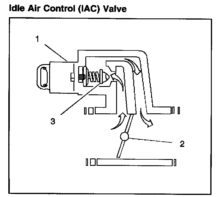 The purpose of the IAC valve is to control the engine idle speed, while preventing stalls due to changes in the engine load. The IAC valve (1), mounted in the throttle body, controls the bypass air around the throttle valve (2). By moving a conical valve known as a pintle (3), in, towards the seat, in order to decrease the air flow, or out, away from the seat, in order to increase the air flow, a controlled amount of air can be bypassed. If engine speed is too low, more air is bypassed in order to increase the RPM. If engine speed is too high, less air is bypassed i order to decrease the RPM. The PCM moves the IAC valve in small steps, called counts. These counts can be measured and displayed by a scan tool, which plugs into the Data Link Connector (DLC). The PCM calculates the proper position of the IAC valve during idle based on the battery voltage, the coolant temperature, the engine load, and the engine RPM. If the RPM drops below specification and the throttle valve is closed, the PCM senses a near stall condition and calculates a new valve position in order to prevent stalling.