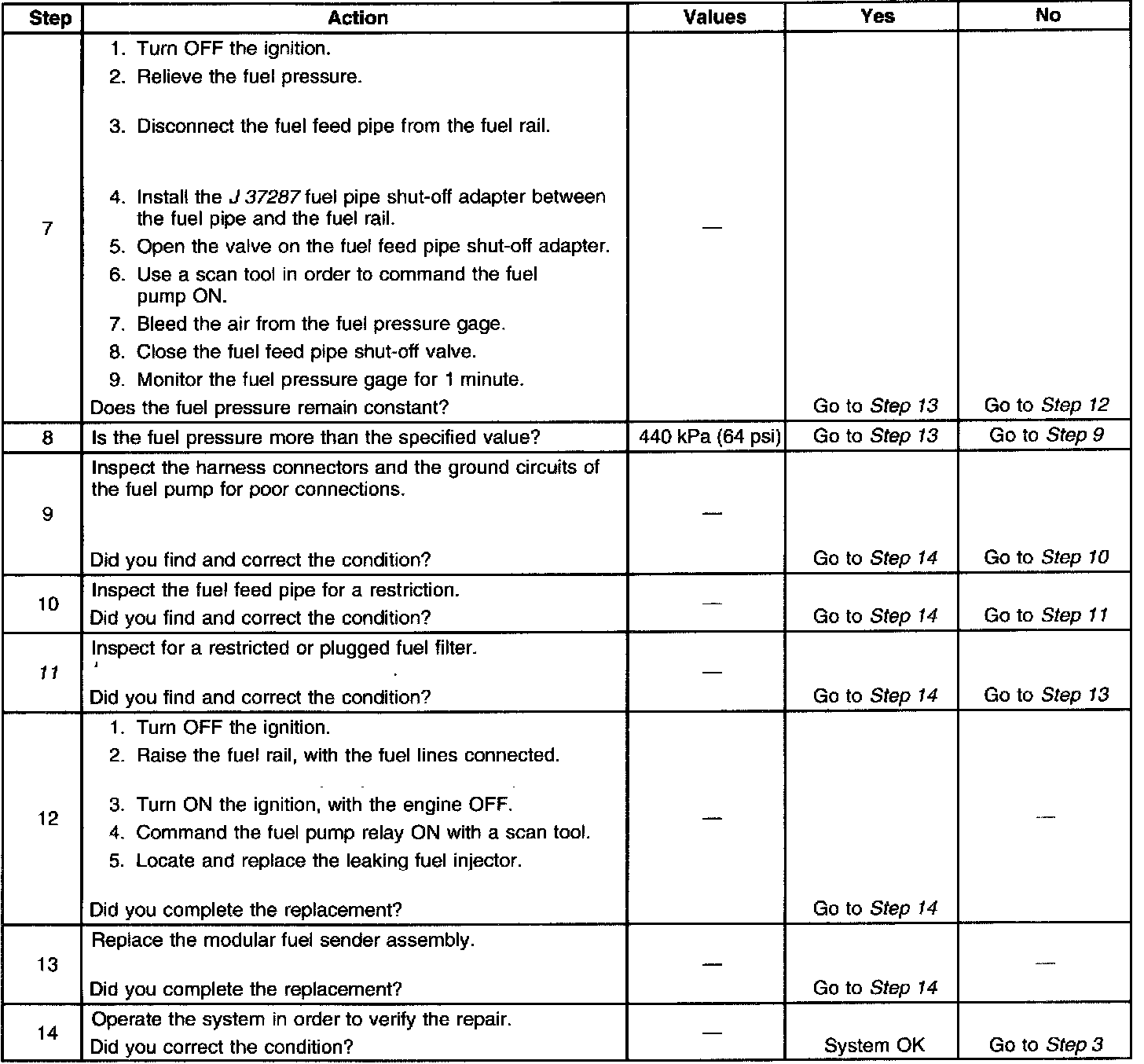 4. This step tests that the fuel system can maintain fuel pressure with the pump Off. A fuel pressure drop of more than 34 kPa (5 psi) within the specified time indicates a leak in the fuel system.