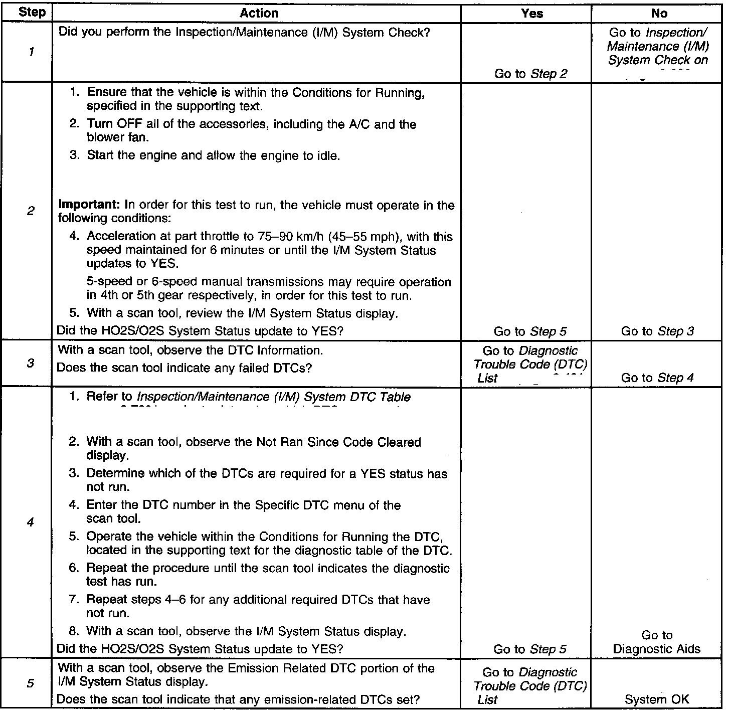 3. This step is to identify a first failure of a type B DTC. A DTC only appears on the I/M System Status display when the DTC becomes a MIL-illuminating DTC. This occurs on the second failure of a type B DTC. A first failure of a type B DTC will not allow the I/M System Status to update to YES.