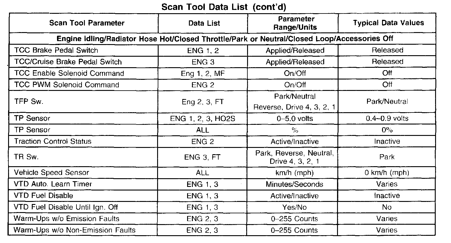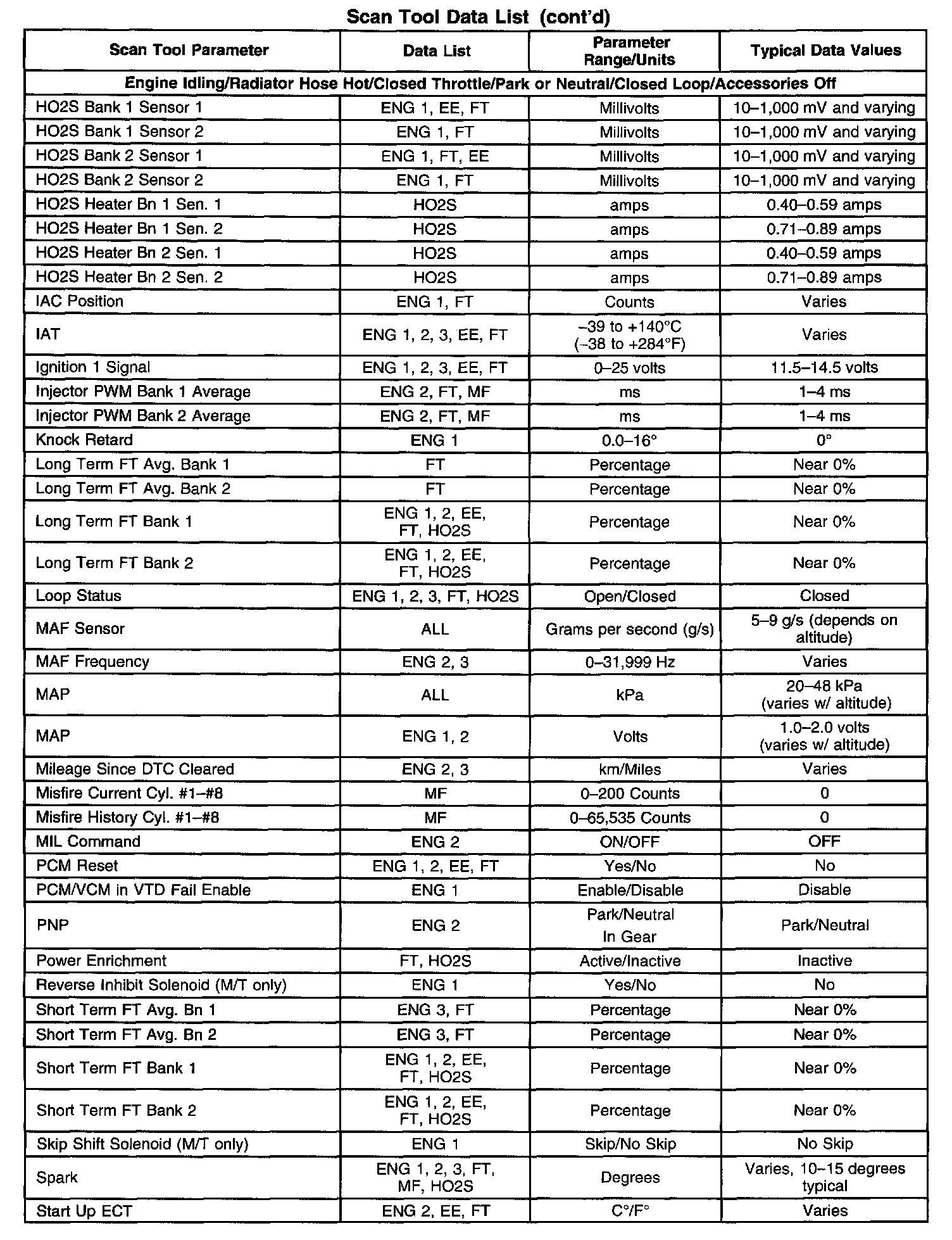 The Engine Scan Tool Data List contains all engine related parameters that are available on the scan tool. The list is arranged in alphabetical order. A given parameter may appear in any one of the data lists, and in some cases may appear more than once, or in more than one data list in order to group certain related parameters together.