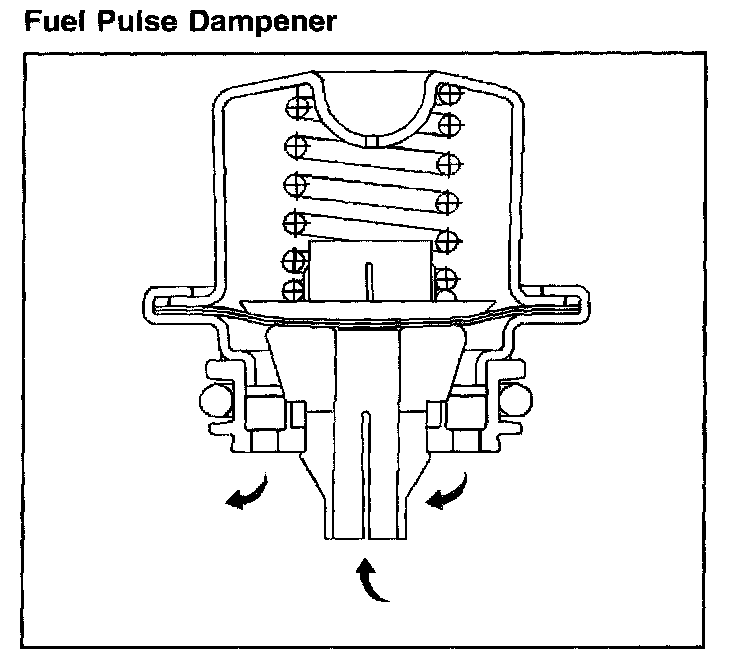 The fuel pulse dampener attaches inside a housing on the fuel rail assembly. The fuel pulse dampener is diaphragm-operated, with fuel pump pressure on one side and with spring pressure on the other side. The function of the dampener is to dampen the fuel pulsation.