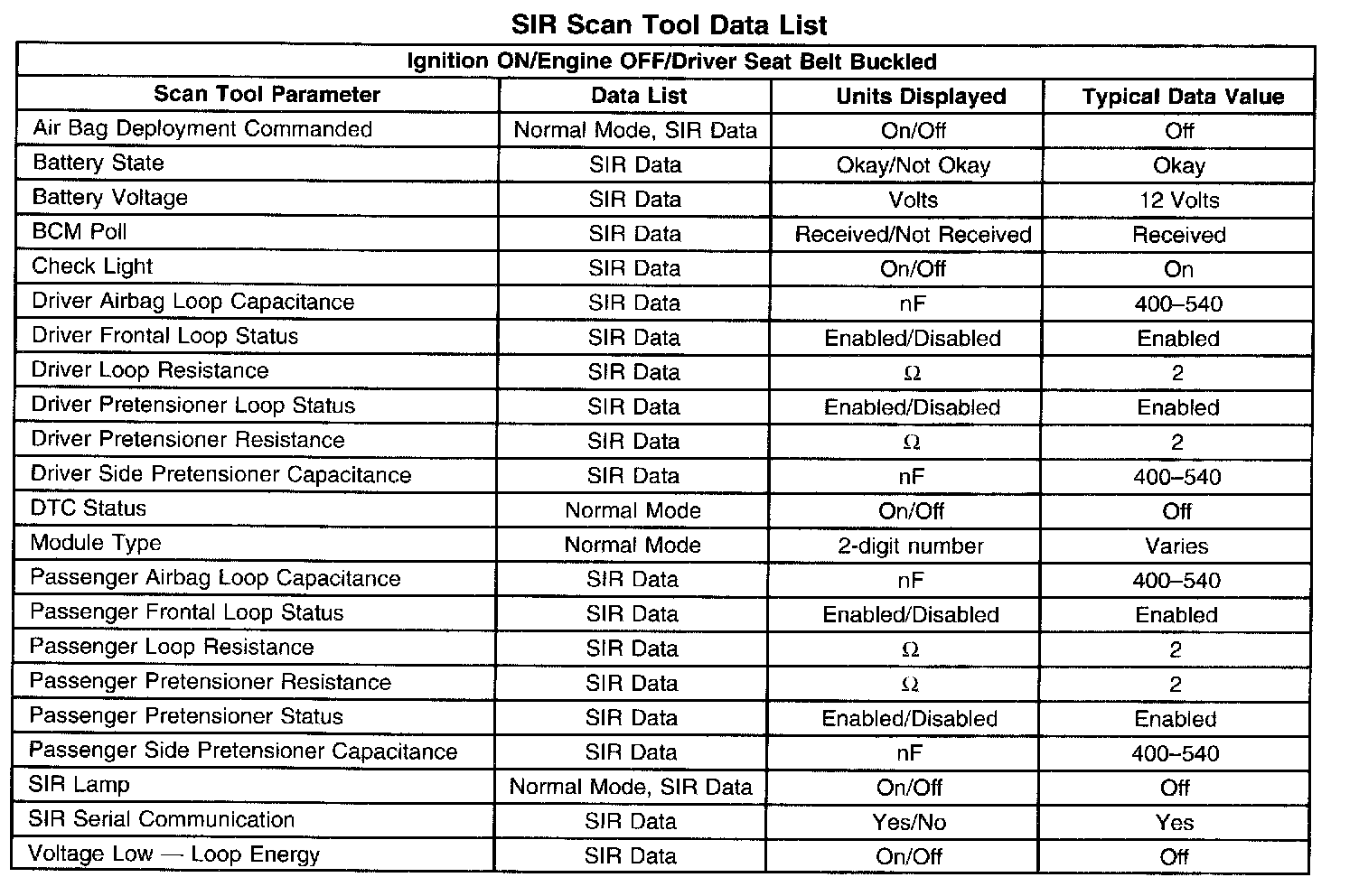 Use the SIR Scan Tool Data List as directed by a diagnostic table or in order to supplement the diagnostic procedures. Begin all of the diagnostic procedures with the SIR Diagnostic System Check. Use the SIR Scan Tool Data List after the following are determined:
