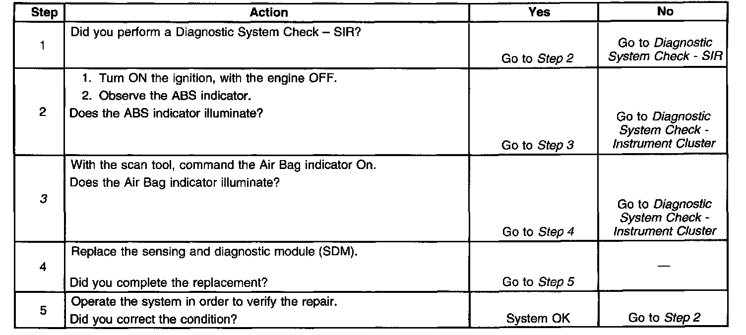 The ignition switch supplies battery voltage to the AIR BAG indicator using the F13 fuse. The AIR BAG indicator is controlled by the sensing and diagnostic module (SDM) via UART data. When the ignition switch is first turned to the ON position, the SDM responds by illuminating the AIR BAG indicator for approximately six seconds while performing diagnostic tests on the SIR system.