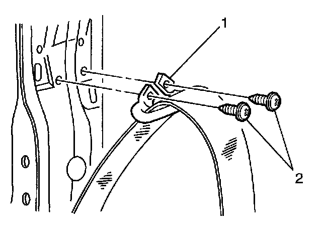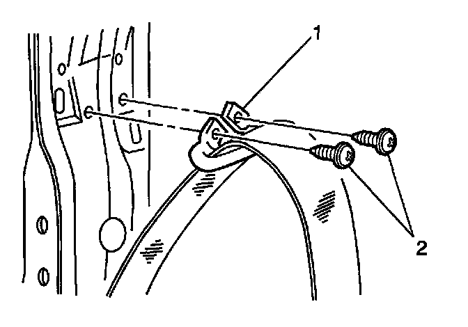 2. Install the intermediate seat belt guide (1) to the vehicle. Secure the guide with the screws (2).