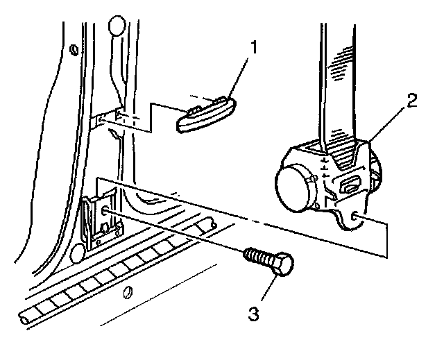 9. Remove the front seat belt retractor bolt (3) and the front seat belt retractor (1).