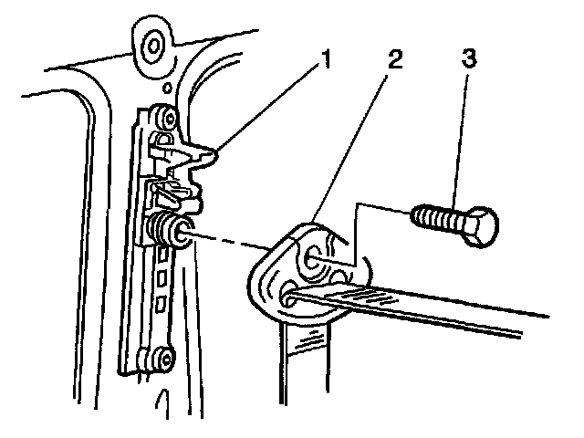 3. Install the front seat belt upper guide (2) to the vehicle. Secure the guide with the bolt (3).