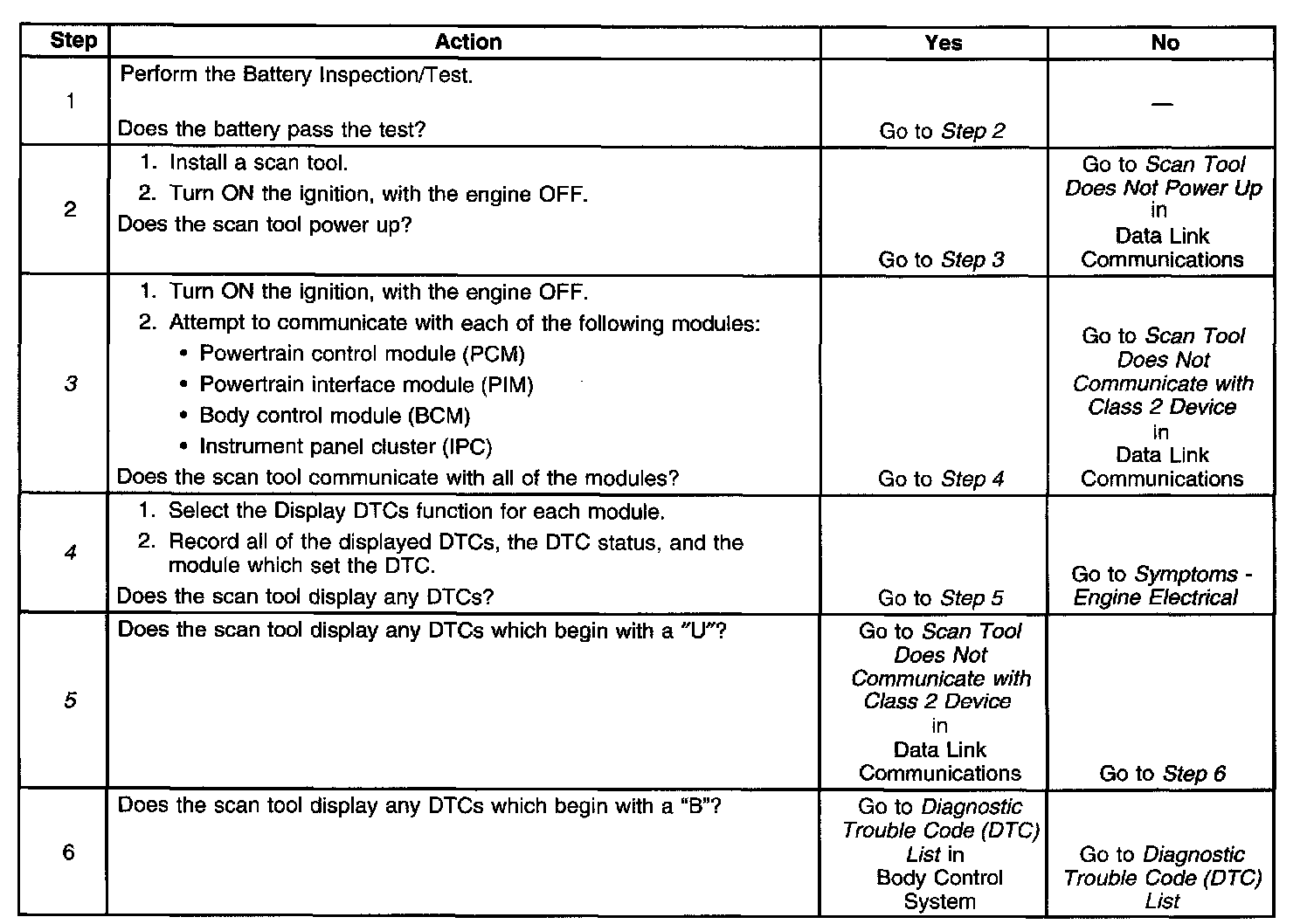 3. Lack of communication may be due to a partial or total malfunction of the class 2 serial data circuit or due to a partial or total malfunction of the UART data circuit. The specified procedure will determine the particular condition.