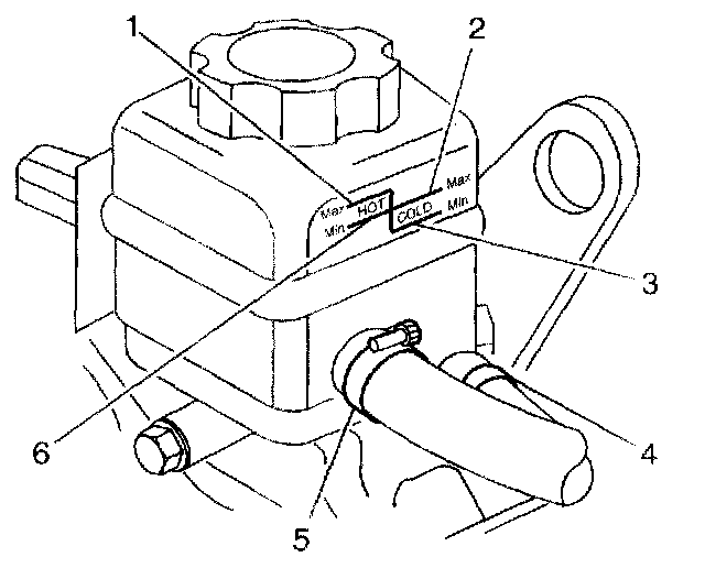 9. Add fluid to the reservoir in order to keep the fluid level above the COLD MIN mark (3)