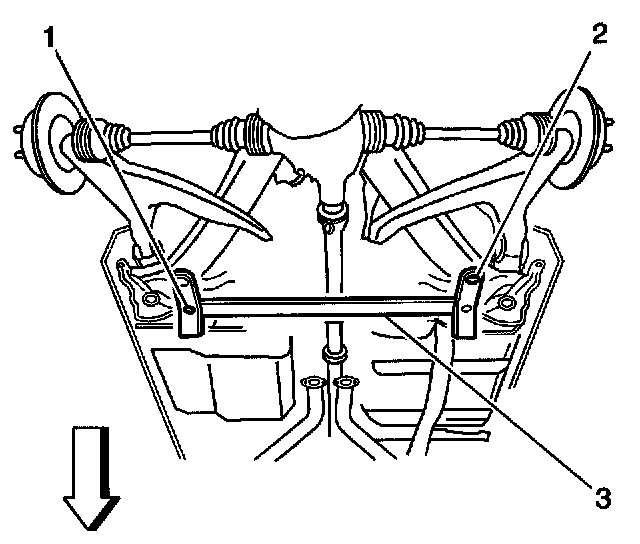 12. With the aid of an assistant, position the rear suspension support. The locating pins (2) of the CH-46839 engage the alignment holes in the rear suspension support.